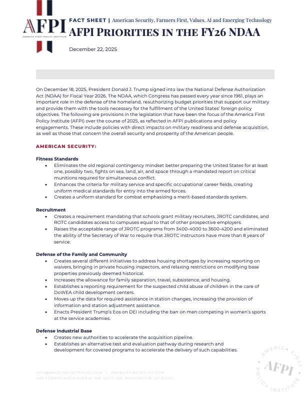 On December 18, 2025, President Donald J. Trump signed into law the National Defense Authorization Act (NDAA) for Fiscal Year 2026. The NDAA, which Congress has passed every year since 1961, plays an important role in the defense of the homeland, reauthorizing budget priorities that support our military and provide them with the tools necessary for the fulfillment of the United States’ foreign policy objectives. The following are provisions in the legislation that have been the focus of the America First Policy Institute (AFPI) over the course of 2025, as reflected in AFPI publications and policy engagements. These include policies with direct impacts on military readiness and defense acquisition, as well as those that concern the overall security and prosperity of the American people.