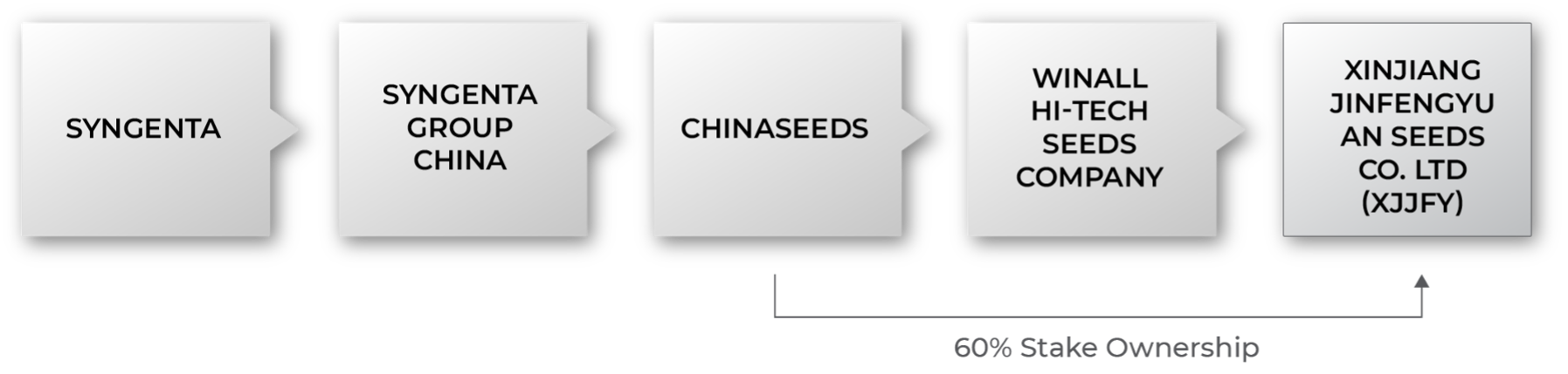 Especially disturbing is Syngenta Group’s alleged complicity in slave labor and violations of human rights. Syngenta’s China arm, Syngenta Group China, has a vast network of subsidiaries and constituent firms throughout the PRC, spanning the country. One such subsidiary is Xinjiang Jinfengyuan Seed Industry Co., Ltd, which is owned through a triple-layered structure: Syngenta Group China consolidated its (Syngenta, 2021) subsidiary Winall Hi-Tech Seeds Company into its ownership of Chinaseeds (Sinochem Group, 2023), which itself, as of 2021, owned a 60% stake (MarketScreener, 2021) in Xinjiang Jinfengyuan Seeds Co., Ltd. This ownership structure—subsidiaries nestled within nebulous ownership stakes and agreements—allows the activities of these companies to be more easily hidden. Syngenta profits massively from such obfuscation.