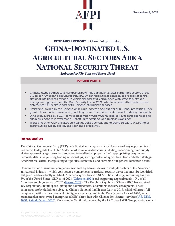 Chinese-owned agricultural companies now hold significant stakes in multiple sectors of the American agricultural industry—which constitutes a comprehensive national security threat that must be identified, mitigated, and eventually nullified. American agriculture is a $1.5 trillion industry, accounting for over 5% of the United States' GDP (Zahniser, 2024) and supporting approximately 10% of all American employment (Kassel, 2023). The People’s Republic of China (PRC) has acquired key corporations in this space, giving the country control of strategic industry chokepoints. These companies are by definition subject to China’s National Intelligence Law of 2017, which obligates full compliance with state security and intelligence agencies, and to the Data Security Law of 2020, which mandates that state-owned enterprises (SOEs) share data with Chinese intelligence services (U.S. DHS, 2020; Rafaelof et al., 2020). For example, Smithfield, owned by the PRC-based WH Group, controls one-quarter of U.S. pork production (Gelsi, 2025). This has granted them market dominance, enabling them to set prices and establish industry standards (In Re Pork Antitrust Litigation, 2025). Another agri-business, Syngenta, is a state-owned PRC company that lobbies certain key federal agencies that determine U.S. trade and agricultural policy, and it allegedly engages in systematic IP theft, data scraping, and Uyghur slave labor.