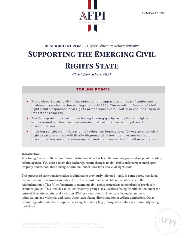 This process of state transformation is eliminating previously tolerated—and, in some cases, mandated—discrimination from American public life. This is most evident at elite universities where the Administration’s Title VI enforcement is extending civil rights protections to members of previously excluded groups. This includes so-called “majority groups” (i.e., whites) facing discrimination under the guise of diversity, equity, and inclusion (DEI) policies; Jewish Americans facing harassment, intimidation, and violence; and Asian Americans facing discrimination in college admissions. Other divisive agendas linked to misapplied civil rights statutes (e.g., transgender policies) are similarly being rooted out.