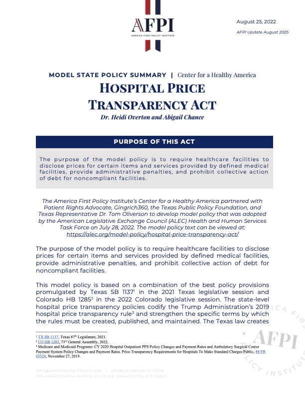 The America First Policy Institute’s Center for a Healthy America partnered with Patient Rights Advocate, Gingrich360, the Texas Public Policy Foundation, and Texas Representative Dr. Tom Oliverson to develop model policy that was adopted by the American Legislative Exchange Council (ALEC) Health and Human Services Task Force on July 28, 2022. The model policy text can be viewed at: https://alec.org/model-policy/hospital-price-transparency-act/