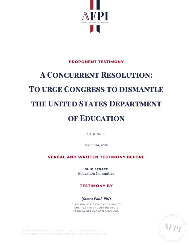 My name is James Paul, and I am the director of state education policy at America First Policy Institute (AFPI), a 501(c)(3) nonprofit that develops research and policy to put the American people first. When it comes to education, AFPI empowers parents to find learning environments that work best for kids. Thank you for the opportunity to testify in support of Senate Concurrent Resolution 16.