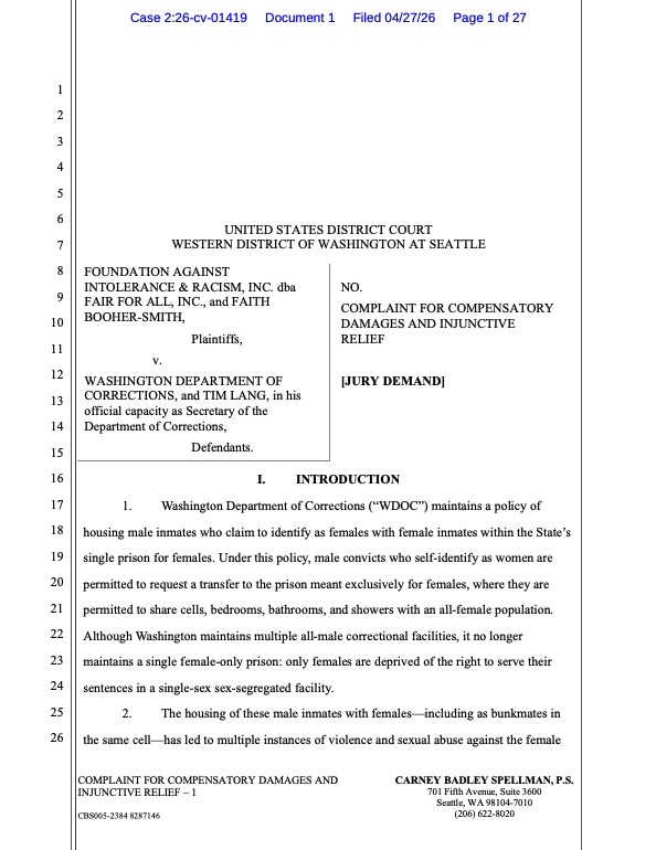 The suit was filed on behalf of plaintiffs Fair for All, Inc. and Faith Booher-Smith, a female inmate at the Washington Corrections Center for Women who alleges she was violently attacked by a male inmate transferred into the facility under the challenged policy.