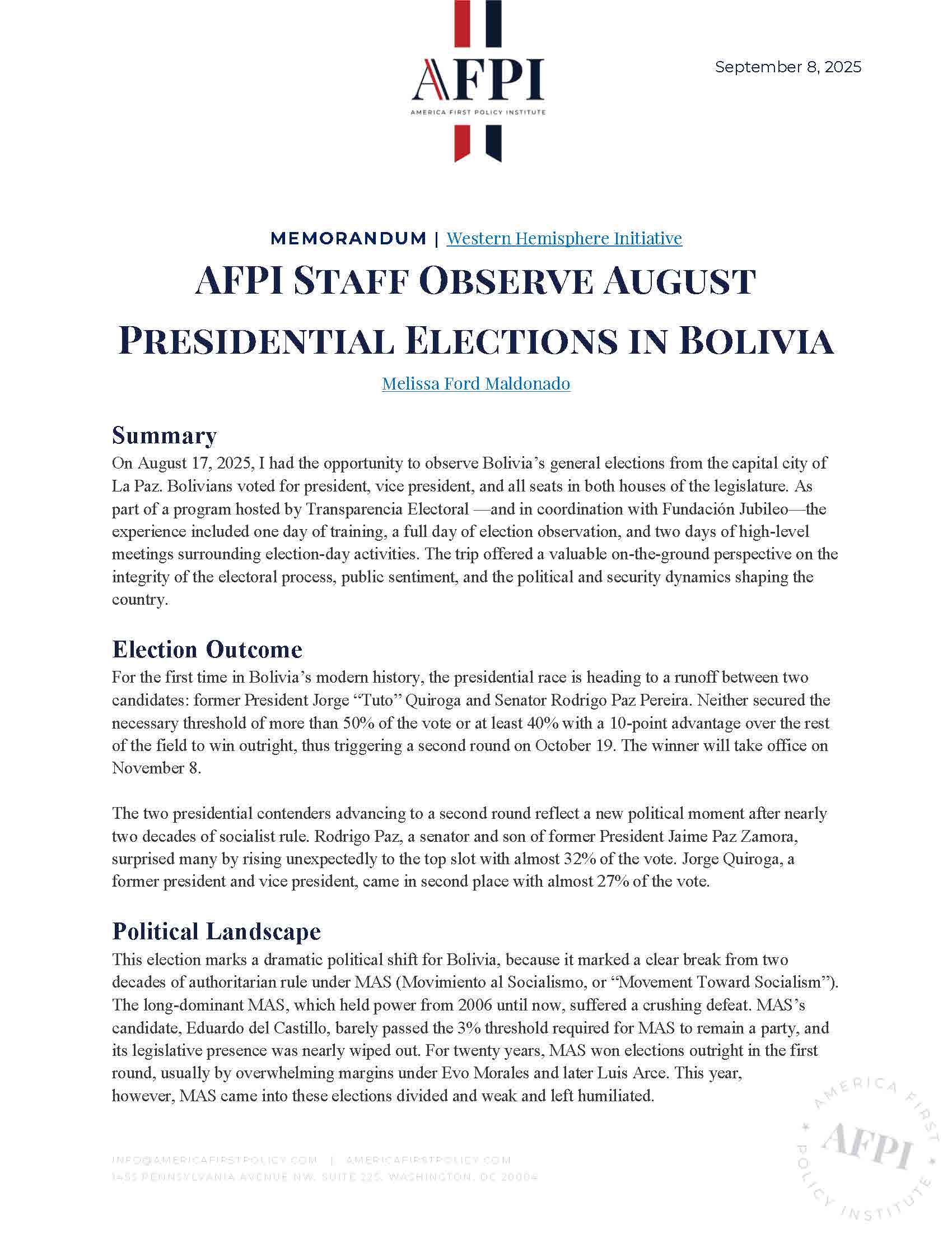 For the United States, the changes happening in Bolivia present an opportunity. This moment is not unique to Bolivia but is part of a larger shift across our hemisphere. From Argentina to Ecuador and now Bolivia, with elections ahead in Chile, Honduras, Costa Rica, Colombia, Brazil, and beyond, people are turning away from the false promises of socialism and authoritarianism and are demanding real sovereignty, accountability, and change. We have yet to see what happens in the runoff, but the direction is clear, and the United States should seize this moment. Advancing America First goals in the hemisphere means supporting countries and leaders who reject authoritarianism, defend national sovereignty, and counter the growing influence of the People’s Republic of China and Iran.