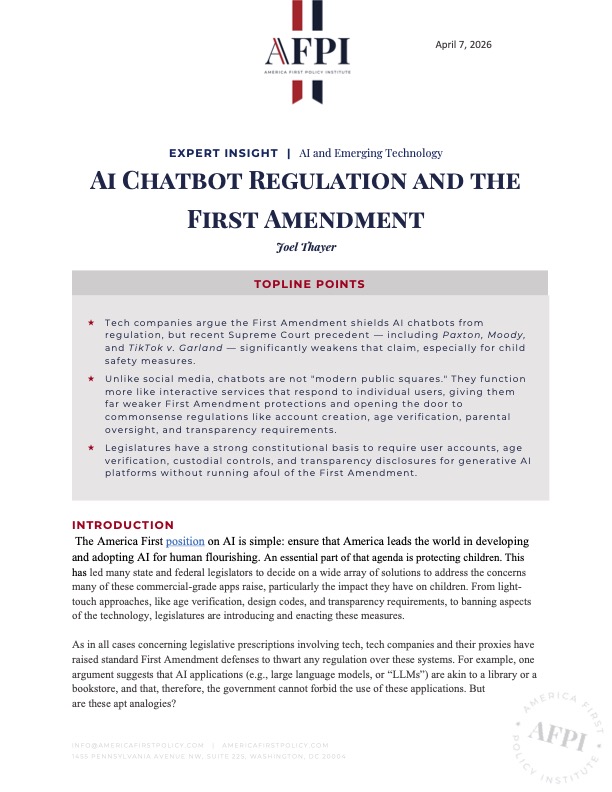 The issue of child safety is preeminent in an America First AI agenda. One area of AI policy ripe for legislative action is the issue of kids’ access to chatbots. An America First approach recommends the following framework that accomplishes both the goal of protecting children from harmful chatbot apps and promotes free expression.