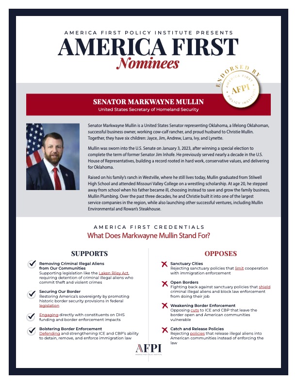 Senator Mullin has delivered key legislative wins, including advancing policies that support American workers, strengthen national security, and promote American identity—most notably, his bill designating the bald eagle as the national bird of the United States, a fitting symbol of American strength and independence.