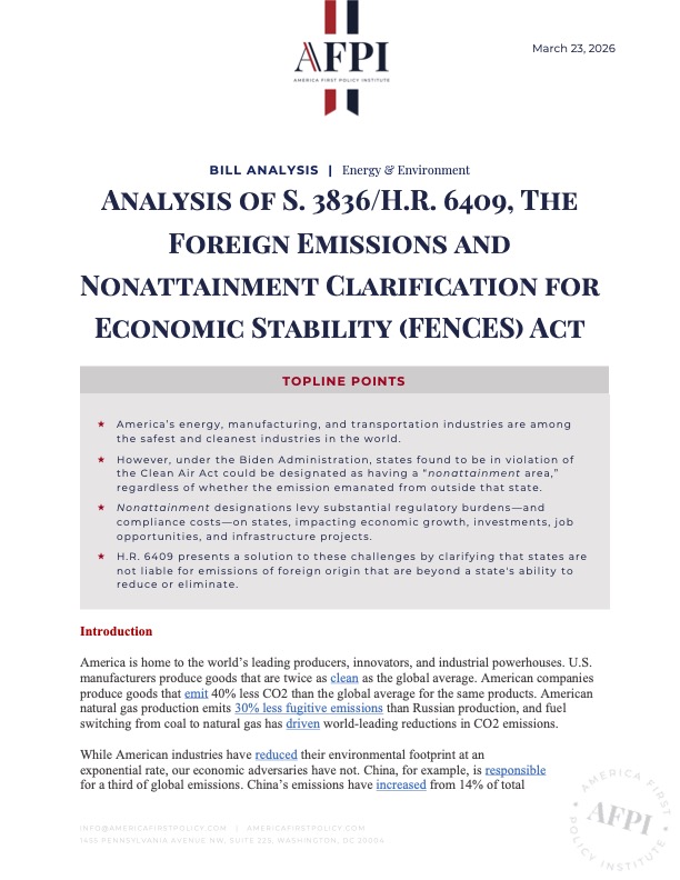 The FENCES Act returns common sense to environmental policy by protecting states from regulatory impacts related to emissions beyond their control, while still ensuring reasonable requirements to reduce harmful emissions. As AFPI research outlines, the United States is a global leader in air quality and environmental stewardship, with relatively low emissions relative to peers around the world and active contributions to global health through air quality monitoring in more than 50 cities across three dozen countries. American industries should not be penalized for poor air quality standards emanating from nations with far weaker environmental commitments. The FENCES Act provides clarity and predictability, protects the environment, and streamlines regulation to allow American businesses the freedom to operate and provide world-class products and services.