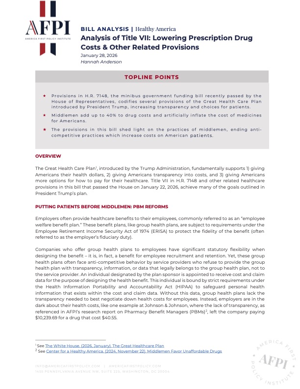 The Great Health Care Plan[1], introduced by the Trump Administration, fundamentally supports 1) giving Americans their health dollars, 2) giving Americans transparency into costs, and 3) giving Americans more options for how to pay for their healthcare. Title VII in H.R. 7148 and other related healthcare provisions in this bill that passed the House on January 22, 2026, achieve many of the goals outlined in President Trump’s plan.