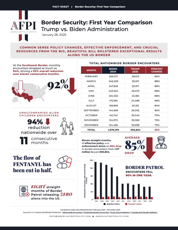 At the Southwest Border, monthly encounters dropped as much as 94%, driving a 92% overall reduction over eleven consecutive months.