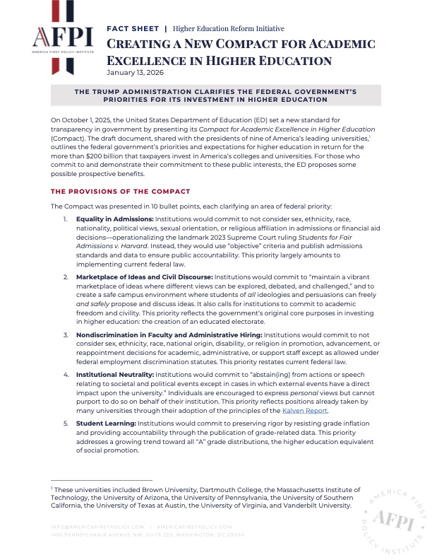 On October 1, 2025, the United States Department of Education (ED) set a new standard for transparency in government by presenting its Compact for Academic Excellence in Higher Education (Compact). The draft document, shared with the presidents of nine of America’s leading universities,[1] outlines the federal government’s priorities and expectations for higher education in return for the more than $200 billion that taxpayers invest in America’s colleges and universities. For those who commit to and demonstrate their commitment to these public interests, the ED proposes some possible prospective benefits.