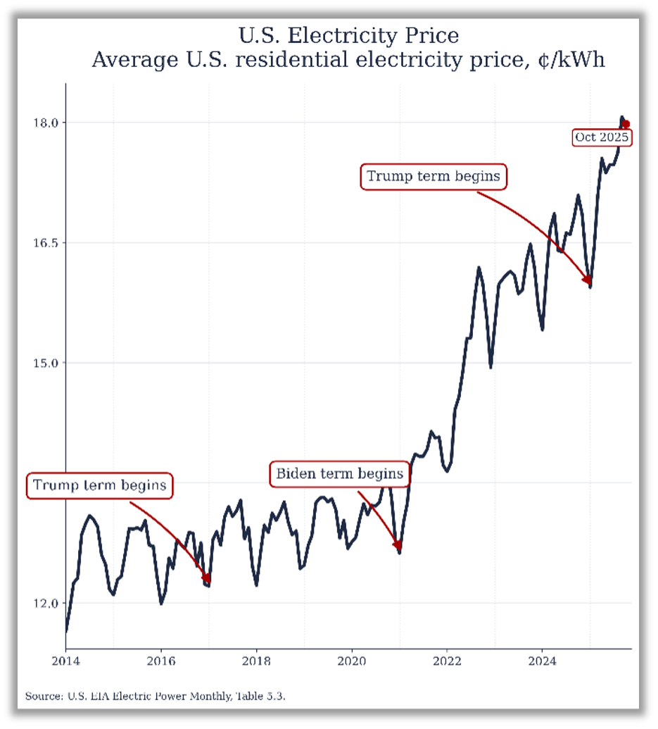 Note: Figure 3 summarizes state-by-state residential electricity prices in November 2025. The map reports a national average of 18 ¢/kWh for shows substantial variation across states.