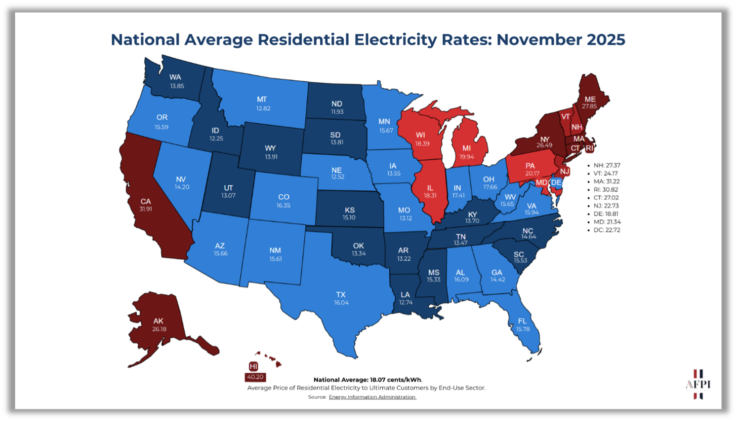 Although rising electricity prices are felt by consumers nationwide, the reality is more complex than the national average. This is because states that protect energy freedom (meaning policies that prioritize affordability and reliability by allowing a full range of energy resources, rather than steering the grid through technology mandates, emissions targets, or preferential subsidies) are more affordable, while states with harsh “green” mandates pay more, because state laws can have enormous impacts on electricity prices. States like California, Hawaii, and New York—which have disproportionately higher electricity prices—drive up the national average.