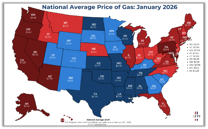 Note: Figure 1 summarizes state-by-state retail gasoline prices in January 2026. The map reports a national average of $2.81 per gallon for regular grade gasoline.