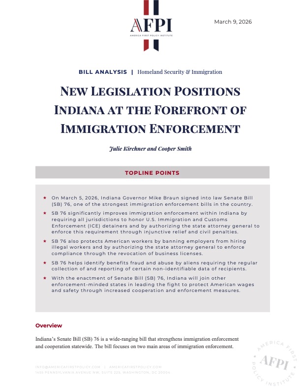 Indiana’s Senate Bill (SB) 76 is a wide-ranging bill that strengthens immigration enforcement and cooperation statewide. The bill focuses on two main areas of immigration enforcement. First, SB 76 amends Indiana’s existing anti-sanctuary law, originally adopted in 2011, to require all jurisdictions to honor immigration detainers and to close loopholes that impede enforcement. Second, the bill bars employers from hiring illegal workers. Finally, SB 76 helps identify benefits fraud and abuse through the collection and reporting of certain non-identifiable data of recipients.