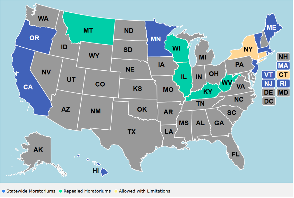 - Connecticut and New York have narrower but still severe restrictions on new nuclear power.
