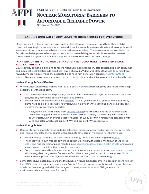 U.S. electricity demand is climbing to record highs as reindustrialization, data centers, and both consumer and industrial electrification add significant levels of new, 24/7 demand. States that wish to benefit from revived American industry and the associated jobs need firm generation capacity, not intermittent sources. Nuclear energy uniquely delivers dense, emissions-free, and reliable power that stabilizes the grid.