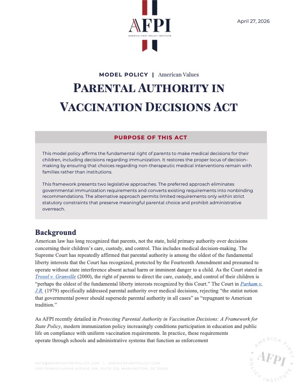 As AFPI recently detailed in Protecting Parental Authority in Vaccination Decisions: A Framework for State Policy, modern immunization policy increasingly conditions participation in education and public life on compliance with uniform vaccination requirements. In practice, these requirements operate through schools and administrative systems that function as enforcement mechanisms—conditions attached to enrollment, attendance, and program eligibility that replace individualized parental judgment with institutional compliance.