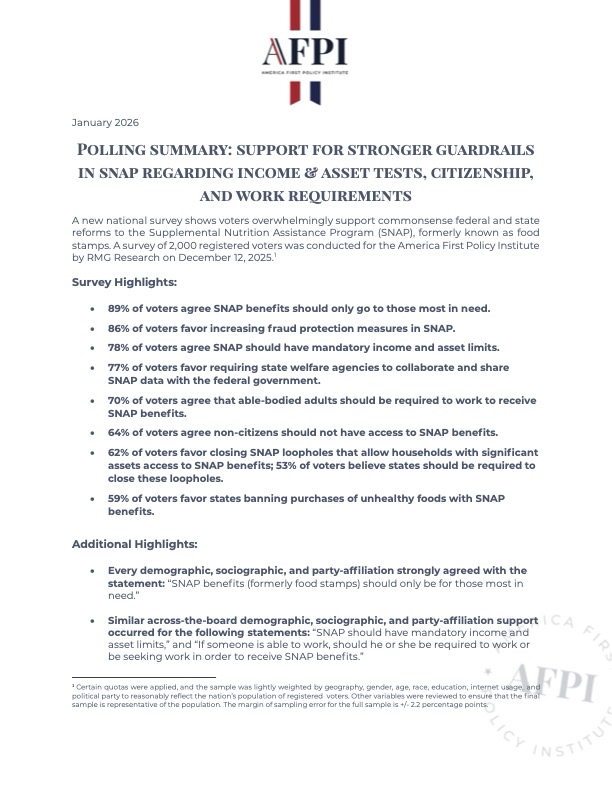 A new national survey shows voters overwhelmingly support commonsense federal and state reforms to the Supplemental Nutrition Assistance Program (SNAP), formerly known as food stamps. A survey of 2,000 registered voters was conducted for the America First Policy Institute by RMG Research on December 12, 2025.[1]