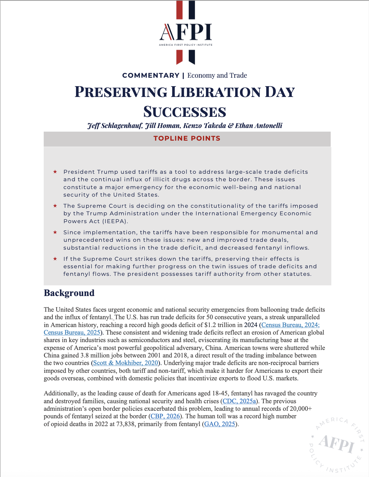 The legality of the IEEPA tariffs is now being challenged before the Supreme Court. AFPI is wholly supportive of the administration’s legal case, believing that the president had the statutory authority to impose tariffs under IEEPA. The Supreme Court upholding the tariffs will clear the path for further victories on persistent trade deficits and fentanyl inflows. If the Supreme Court invalidates the IEEPA tariffs and the tariff rates return to where they were before, foreign countries, no longer facing the threat of high tariffs, may back out of their commitments, and all the attendant policy successes can vanish. In that scenario, it is an economic and national security imperative that the tariffs be recreated through methods other than tariffs under IEEPA. The president could do this by applying a mixture of trade statutes that confer upon him tariff authority, and if insufficient to fully mirror the IEEPA tariffs, he can also turn to non-tariff economic tools or seek congressional action. Whatever the means used, the legacy of Liberation Day can and must live on.