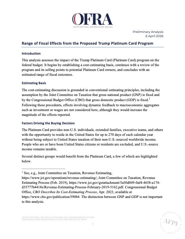 This analysis assesses the impact of the Trump Platinum Card (Platinum Card) program on the federal budget. It begins by establishing a cost-estimating basis, continues with a review of the program and its selling points to potential Platinum Card owners, and concludes with an estimated range of fiscal outcomes.