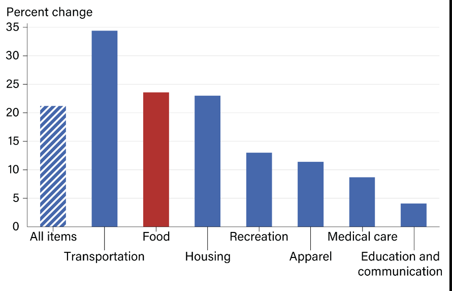 [2] The above chart highlights the relative increase in the all-food CPI compared to the overall all-items CPI and other key index components, underscoring the disproportionate impact of inflation on food prices.