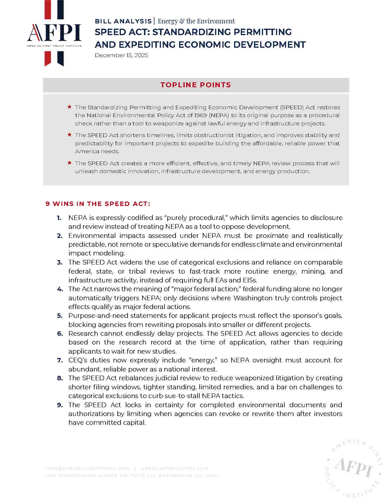 The Standardizing Permitting and Expediting Economic Development (SPEED) Act restores the National Environmental Policy Act of 1969 (NEPA) to its original purpose as a procedural check rather than a tool to weaponize against lawful energy and infrastructure projects.