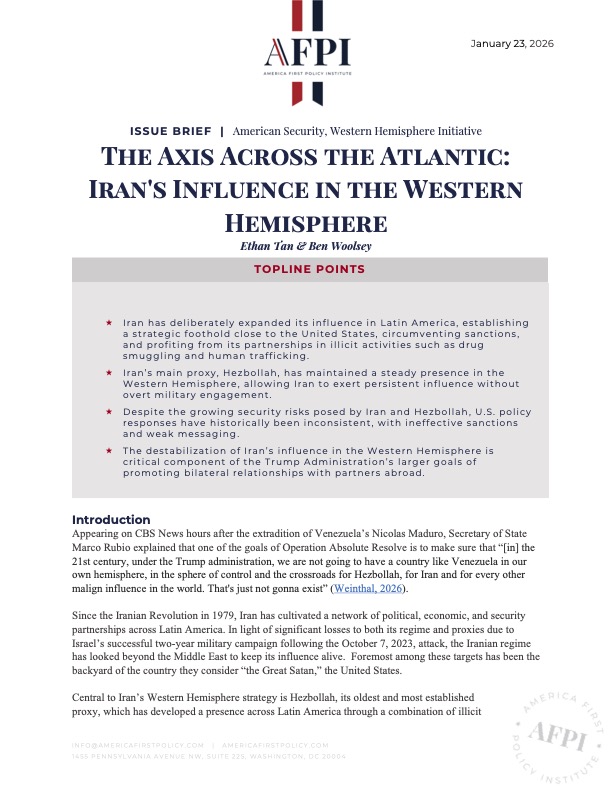 Although weakened, the Iranian regime still poses a threat to the Middle East, and its proxies continue to infiltrate our hemisphere. Alongside the Trump Administration’s efforts to stabilize the Middle East through bilateral partnerships with Arab countries (namely Saudi Arabia and the UAE) and the proposed renewal of the Abraham Accords, dismantling Iranian proxies such as Hezbollah in Latin America is necessary to ensure the security of America First interests in our region. While recent efforts by the United States and Israel have disrupted its operations, Hezbollah has proven effective at expanding its reach and influence worldwide. It's growing financial and leadership structures in the Western Hemisphere not only provide Iran a pathway to re-arm but also place hostile actors in our own sphere of influence. The United States, under President Trump, must eliminate this threat to ensure that America First policies and partnerships will shape the region in the decades to come.