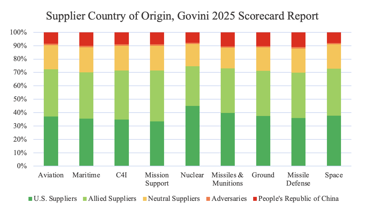 Data reproduced from Govini’s 2025 National Security Scorecard. Sector supplier counts exclude prime vendors, as they are prohibited from being from adversarial countries, and subcontractors. This methodology was the same as that used by Govini in their press releases for their report.