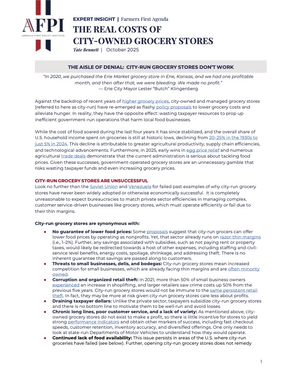 Against the backdrop of recent years of higher grocery prices, city-owned and managed grocery stores (referred to here as city-run) have re-emerged as flashy policy proposals to lower grocery costs and alleviate hunger. In reality, they have the opposite effect: wasting taxpayer resources to prop up inefficient government-run operations that harm local food businesses.